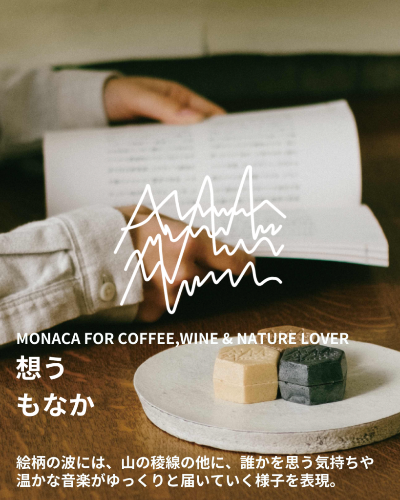 古来より縁起が良いとされる亀甲文様をした六角形をしたもなかの表面には、九州の美しい山々に見えたり、音楽や想いが波のように伝わっていく様にも見える印象的な波模様のデザインを描いており、和菓子ではあまり見かけないシャープでモダンな佇まいが特徴です。