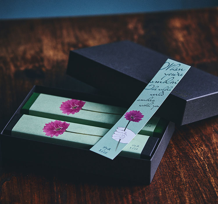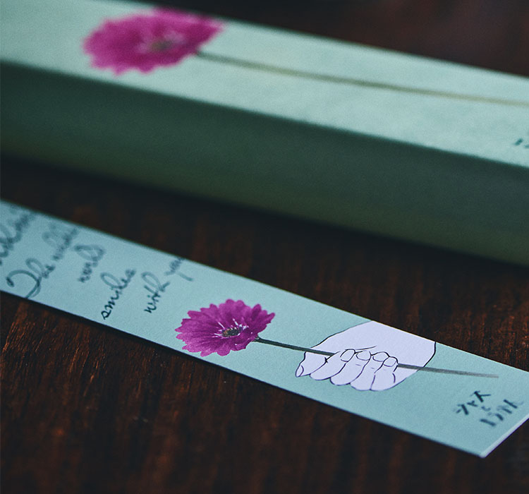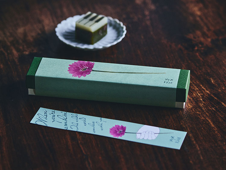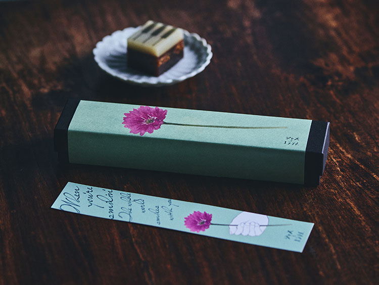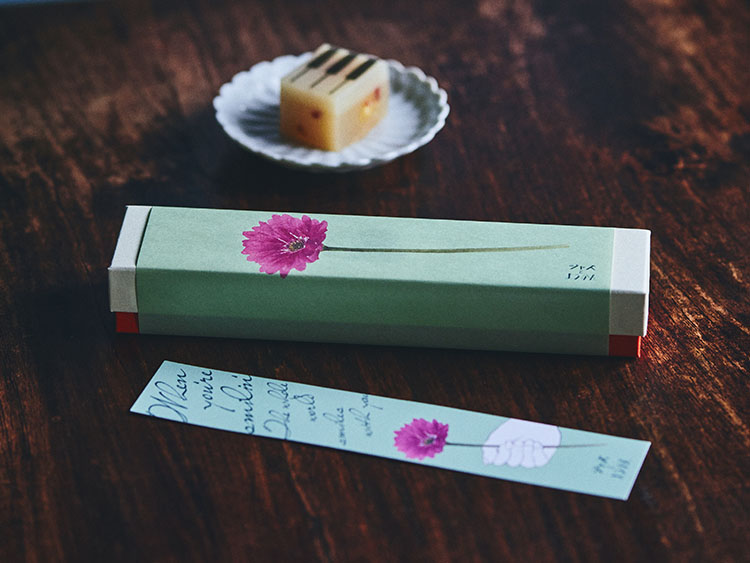 ジャズ羊羹の箱の中にはカードを1枚お入れしています。音楽を愛する作家・takanori masutani氏による描き下ろしイラストには、水墨画ならではの陰影が美しい、深みのある紫がかったガーベラを握る女性の手が繊細、かつ丁寧に描かれています。
