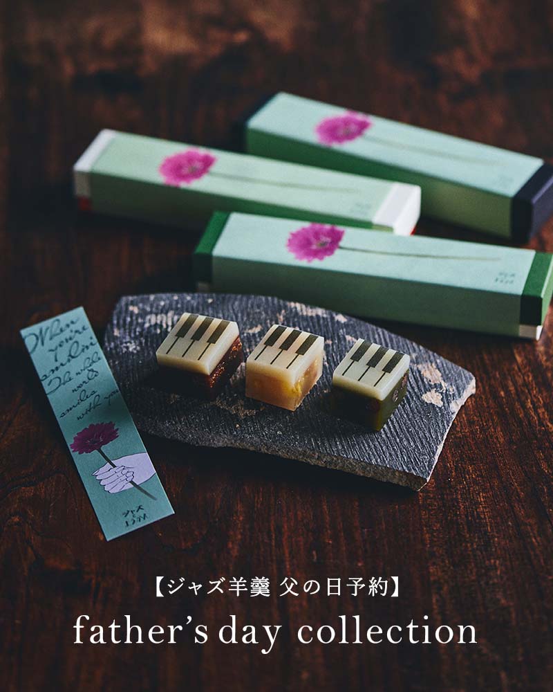 父の日は、オンラインストアの予約商品に限り、作家・takanori masutani氏がジャズとようかんのために水墨画で繊細に描きおろして下さった「1輪の美しいガーベラ」を施した特別仕様を予約特典として無料にてお付けいたします。