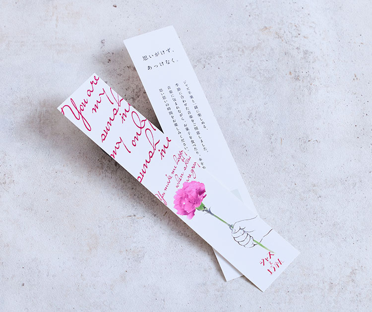 ジャズ羊羹の箱の中にはカードを1枚お入れしています。音楽を愛する作家・takanori masutani氏による描き下ろしイラストには、水墨画ならではの陰影が美しい可憐なピンクのカーネーションと、花を贈ろうと手を伸ばす無垢な子供の手が繊細に描かれています。