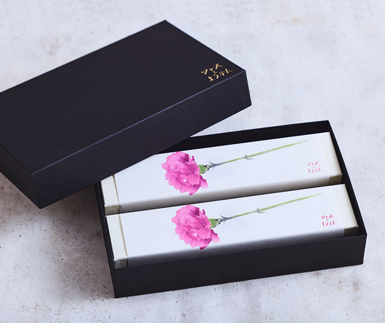 母の日は、オンラインストアの予約商品に限り、作家・takanori masutani氏がジャズとようかんのために繊細な水墨画で描きおろして下さった「1輪の美しいピンク色のカーネーション」を施した特別仕様を予約特典として無料にてお付けいたします。