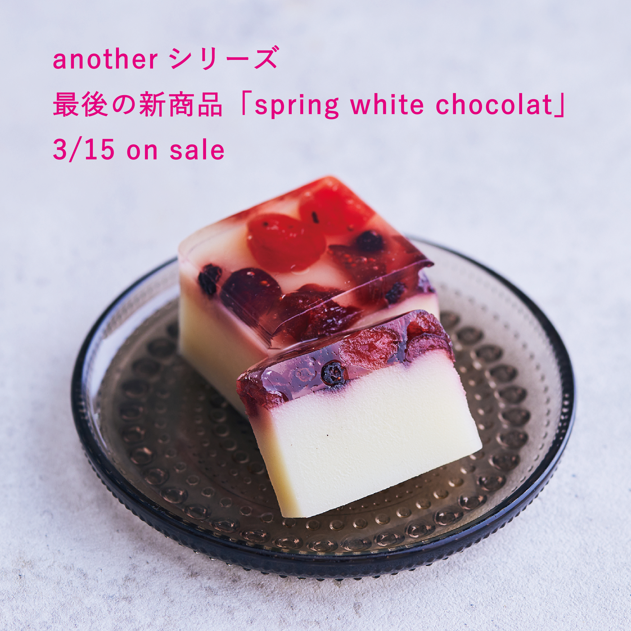 実は昨年末から新作のanotherシリーズの準備を進めていました。another springの表面をホワイトチョコレートの羊羹に載せた彩り鮮やかな商品です。