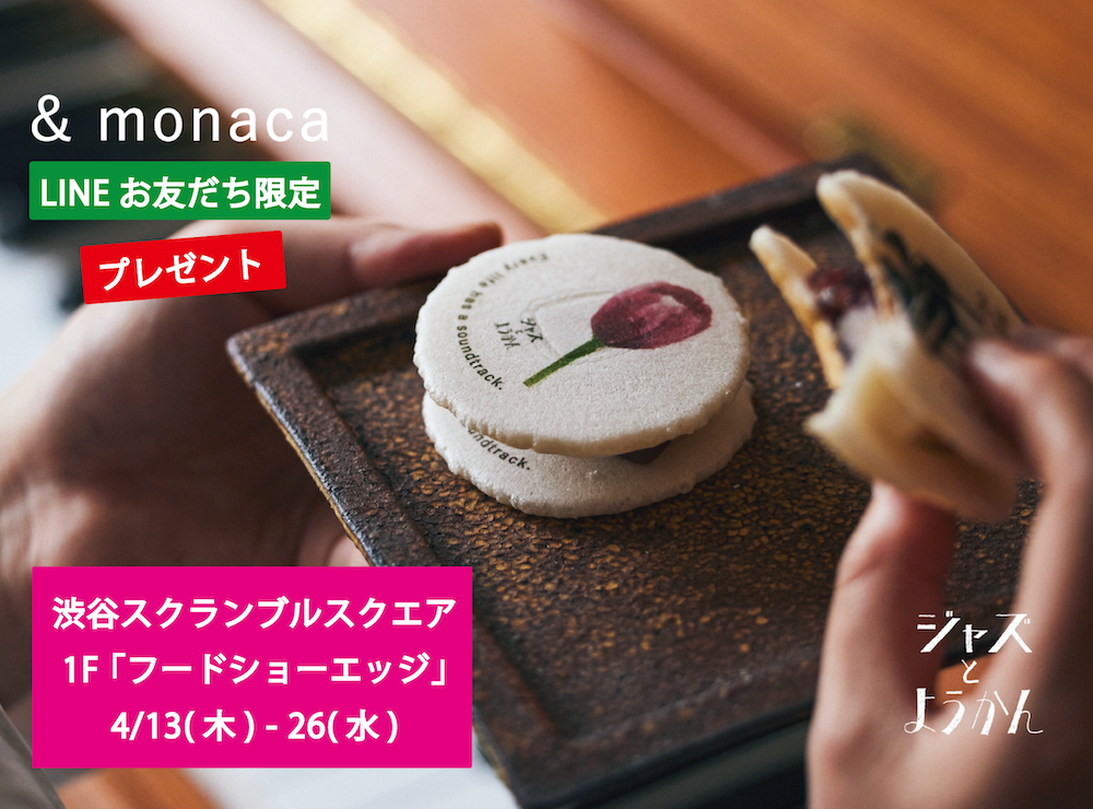 渋谷スクランブルスクエアに4/13〜26まで出店中のジャズとようかんにて、ジャズ羊羹1点お買い上げにつき、LINEお友だちに限り、3月に東京駅でデビューし大好評だった、" ジャズ羊羹をのせて、挟んで" 楽しむ専用のモナカ「& monaca」を1袋(2枚入り) もれなくプレゼントします。