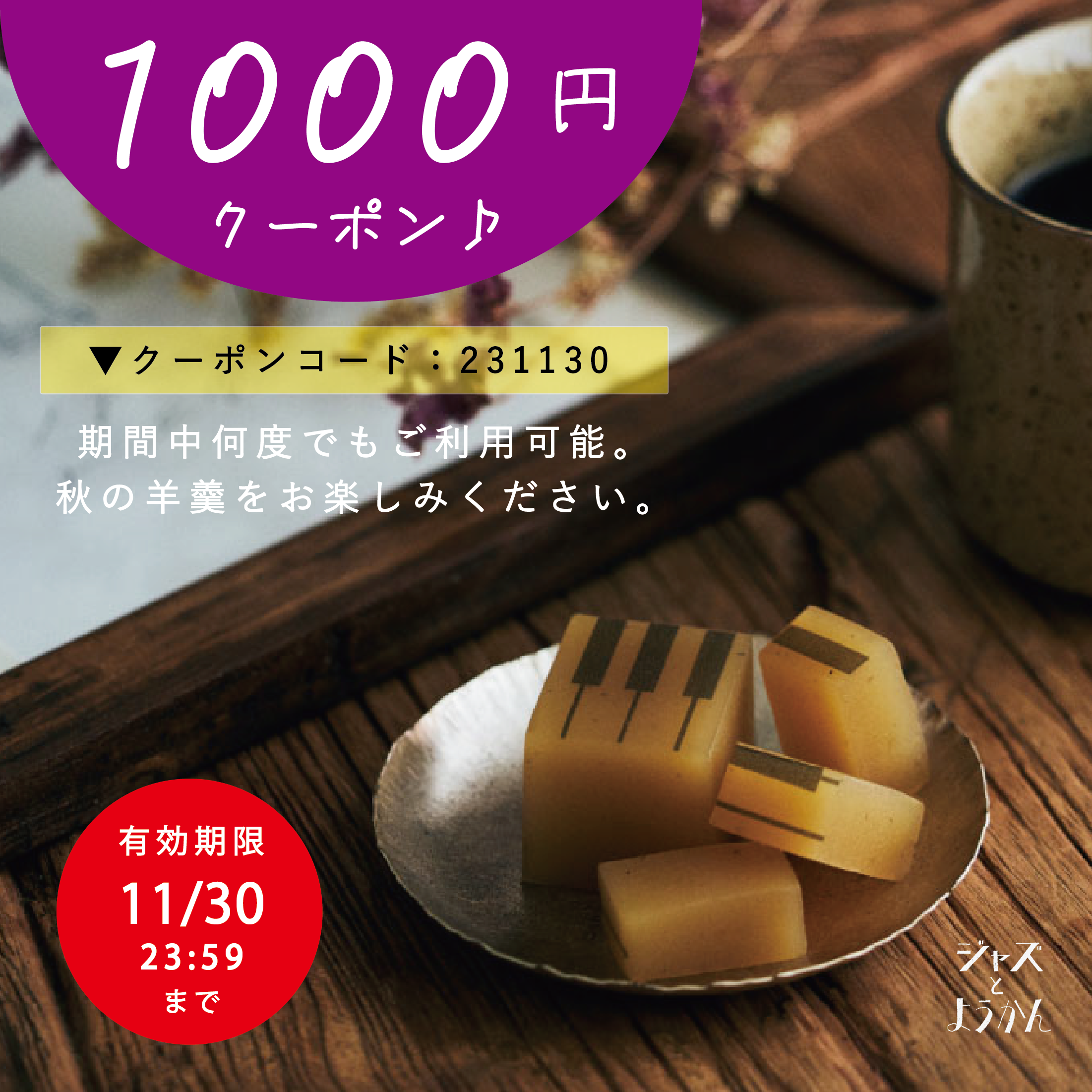 11/30(木) 23:59まで、オンラインスアにてご利用頂ける1000円オフクーポンをプレゼントいたします。クーポンはジャズ羊羹の種類に関係なくご利用いただけます。ぜひご利用ください。
