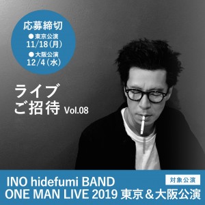 抽選で4組8名様を「INO hidefumi」ライブ東京&大阪公演にご招待! (Wチャンスでさらに5組20名にディスカウントチケットが当たる)