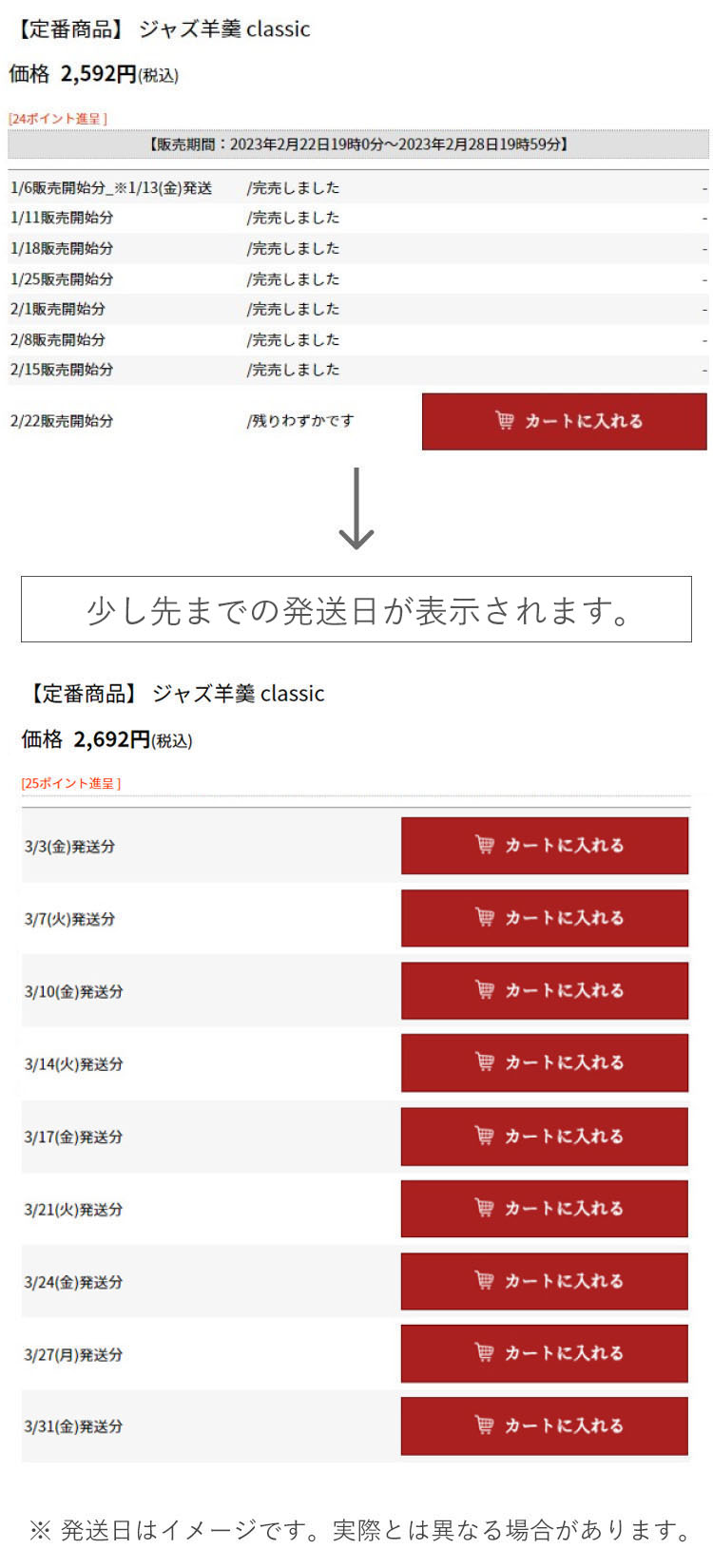 商品ページのカート部分が変更となり、ご希望に近い「発送日」を選択してご注文頂けるようになりましたので、少し先のご予定分のご注文も可能となります。