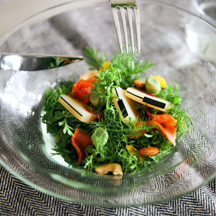 若芽のハーブとサーモン、栄養豊富なナッツをたっぷり入れた夏バテ防止サラダ味噌ドレッシングとフルーツクーラー、ハーブの優しい苦みがサングリアや赤ワインにピッタリ。